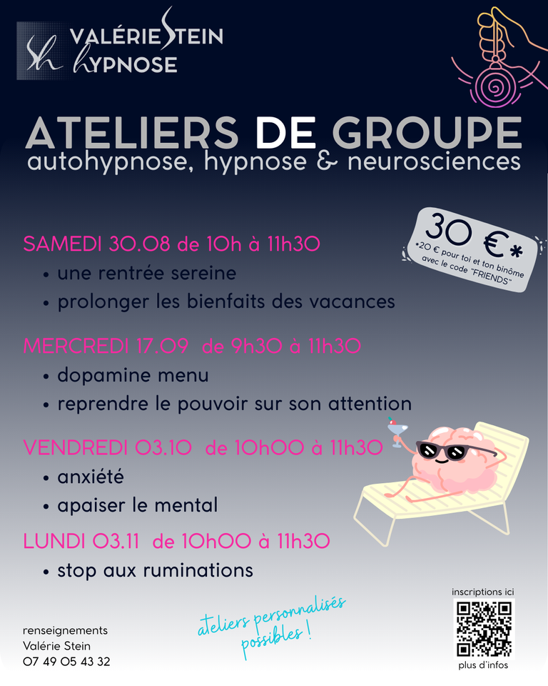 En petit groupe, dans une ambiance tranquille, je te transmets des techniques d'autohypnose que tu pourras réutiliser dans ton quotidien chaque fois que tu en auras besoin. Nous allons travailler sur la tranquillité mentale, stopper les ruminations pour un retour au calme des pensées.